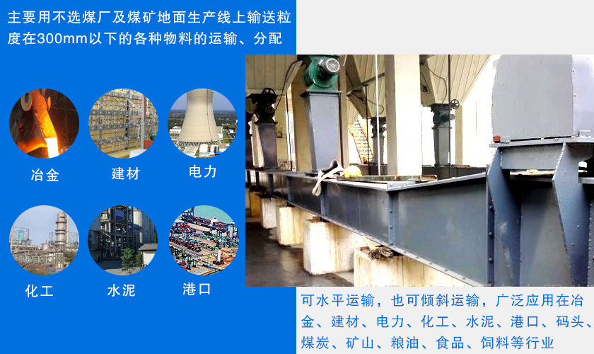 刮板鏈式輸送機主要用不選煤廠及煤礦地面生產線上輸送粒度在300mm以下的各種物料的運輸、分配。可水平運輸,也可傾斜運輸,廣泛應用在冶金、建材、電力、化工、水泥、港口、碼頭、煤炭、礦山、糧油、食品、飼料等行業。