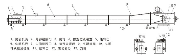 機尾:由機尾架、尾輪組、張緊裝置組成,前部用法蘭與中間槽聯接,通過調節尾部的張緊裝置拉緊尾輪組軸承座,可以調節鏈條的張緊程度。