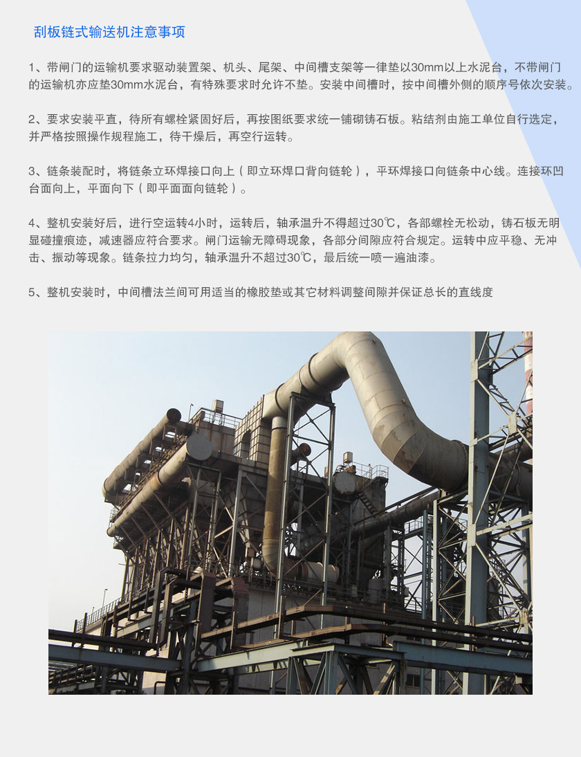 4、整機安裝好后,進行空運轉4小時,運轉后,軸承溫升不得超過30℃,各部螺栓無松動,鑄石板無明顯碰撞痕跡,減速器應符合要求。閘門運輸無障礙現象,各部分間隙應符合規定。運轉中應平穩、無沖擊、振動等現象。鏈條拉力均勻,軸承溫升不超過30℃,最后統一噴一遍油漆。