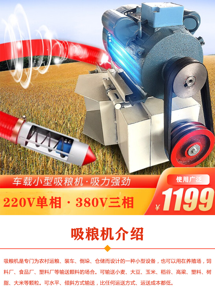吸糧機是農場吸糧、抽糧的好幫手,適合糧食運輸、裝載、堆垛、儲存等,長度3-30米,每小時可輸送20噸糧食,它可以水平、傾斜或垂直輸送谷物。糧食垂直輸送時,每小時輸送量可達6噸。