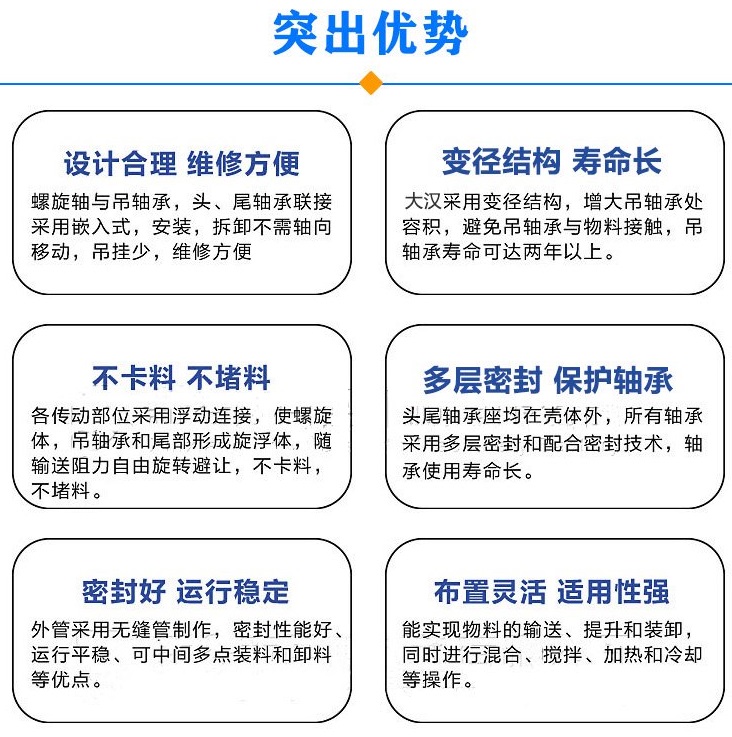 以上是對(duì)螺旋輸送機(jī)的介紹,產(chǎn)品規(guī)格有(管型、U型)(單軸、無(wú)軸),外殼葉片材質(zhì):碳鋼、不銹鋼,根據(jù)被輸送物料的粒度、輸送量和輸送距離,合理選擇和設(shè)計(jì),做到不堵塞、不起拱、出料順暢。