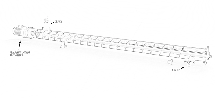 產(chǎn)品經(jīng)進(jìn)料口輸送到螺旋輸送機(jī)殼體后,在內(nèi)螺旋槽內(nèi)受到離心力和管壁摩擦力的作用,隨螺旋葉片旋轉(zhuǎn),沿螺旋槽下滑在重力作用下,使物料不斷地向前推進(jìn)輸送,最后均勻地從出料口排出。