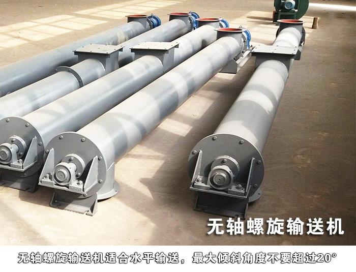 無(wú)軸螺旋輸送機(jī)適合水平輸送,傾斜角度不要超過(guò)20°(根據(jù)實(shí)際的使用情況而言。)