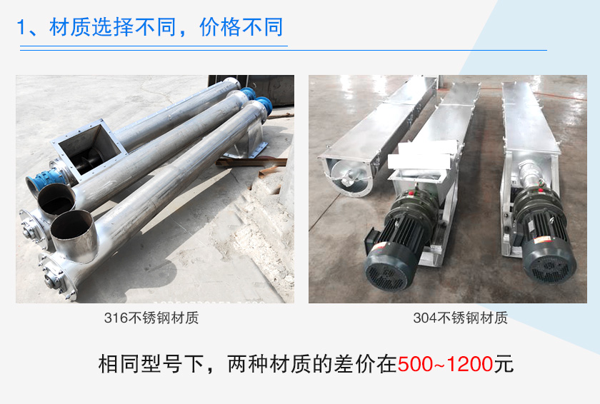 不銹鋼螺旋輸送機選擇的不銹鋼材質一般包含304、316兩種,選擇不同材質,其價格會存在差異化,316不銹鋼材質會比304不銹鋼材質耐腐蝕,能抵抗更高的溫度,當然在制造成本上也會更高,相同型號下,兩種材質的差價在500~1200元。
