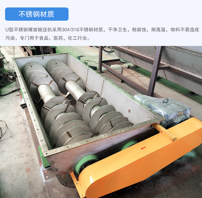 U型不銹鋼螺旋輸送機采用304/316不銹鋼材質,干凈衛生,耐腐蝕,耐高溫,物料不易造成污染,專門用于食品,醫藥,化工行業。